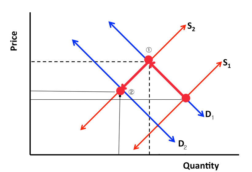 이 분들이 나이가 들면 결국 시장에서는 공급이 줄어들고(S1→S2), 이런 명맥이 끊기면 어쩌지 걱정한다. 그 상품이 계속있는 순간은 가격이 계속 올라갈 것이다. 실생활용어로 '사람구하기 어렵다', '이런 일, 젊은 애들이 안해' '우리나 이런일 하지' 라고 하시기도 한다. (①)